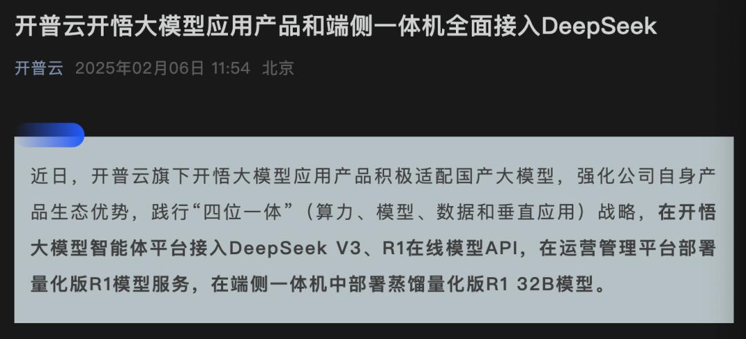 開普云則宣布在開悟大模型智能體平臺接入DeepSeek V3、R1在線模型API,在運營管理平臺部署量化版R1模型服務(wù),在端側(cè)一體機(jī)中部署蒸餾量化版R1 32B模型。