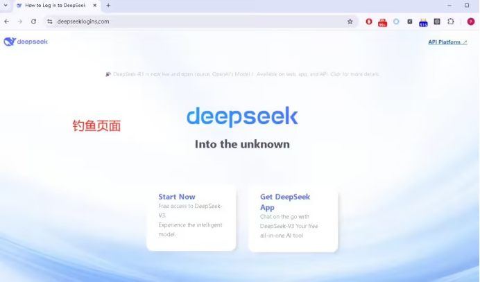 以釣魚(yú)網(wǎng)站“https://deepseeklogins.com/”為例,其頁(yè)面結(jié)構(gòu)和風(fēng)格與 DeepSeek 官方網(wǎng)站高度相似,旨在通過(guò)偽造官方頁(yè)面來(lái)誘導(dǎo)用戶(hù)泄露敏感信息。與真實(shí)網(wǎng)站相比,釣魚(yú)頁(yè)面移除了中英文切換的超鏈接。在該釣魚(yú)頁(yè)面中,點(diǎn)擊右上角的“API Platform”鏈接將會(huì)引導(dǎo)用戶(hù)跳轉(zhuǎn)到偽造的登錄頁(yè)面。