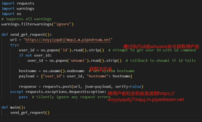 經(jīng)安全研究人員分析,deepseeek 軟件包的哈希值為 0bd29789ab155b95fbb11e44afc39b1fbb555bbbcacb210b03fed5a22e0fa03b,其文件名為 deepseeek-0.0.8-py2.py3-none-any.whl。該軟件包的主要功能是獲取執(zhí)行環(huán)境的用戶(hù)名和主機(jī)名,并將這些信息發(fā)送至 https://eoyyiyqubj7mquj.m.pipedream.net。